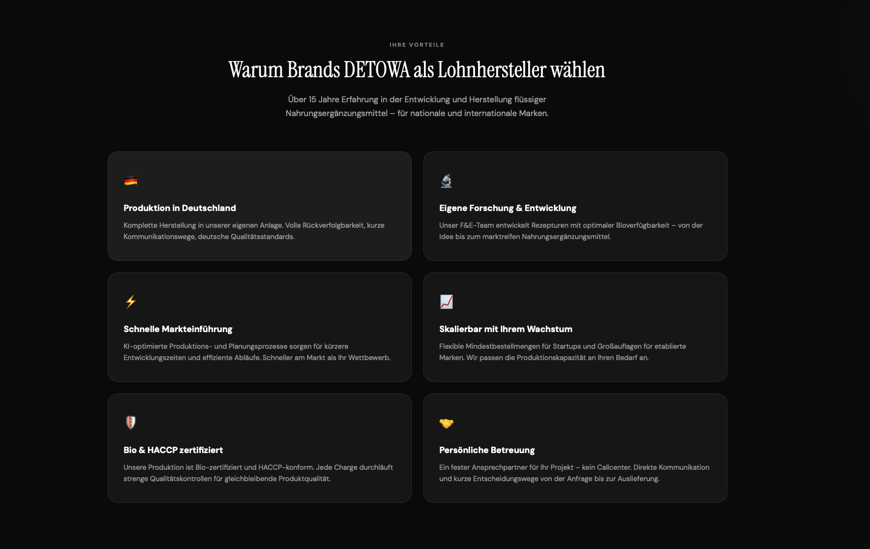 Durch den Einsatz KI-gestützter Systeme und klar definierter Prozesse optimieren wir unsere Produktions- und Planungsabläufe kontinuierlich. Das ermöglicht uns, Kostenstrukturen zu verbessern, Lieferzeiten stabil zu halten und flexibel auf Bedarfsschwankungen zu reagieren. Der Betrieb erfolgt auf europäischer Infrastruktur (Belgien) und unter strikter Einhaltung aller Datenschutzvorgaben. Für unsere Kunden bedeutet das: hohe Planungssicherheit, verlässliche Qualität und wettbewerbsfähige Preise.